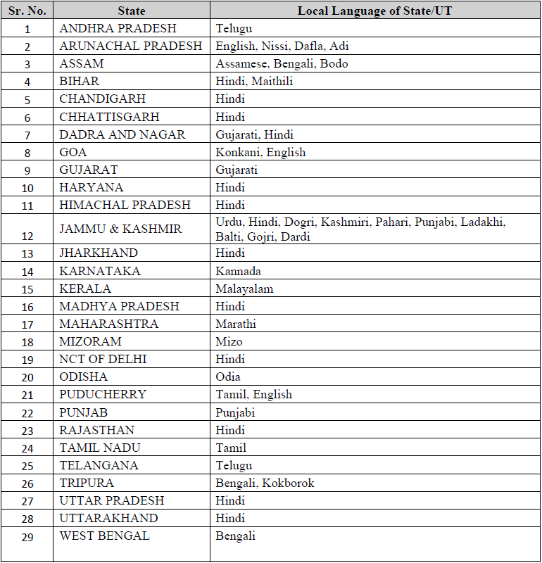 State-wise Local Languages Applicable (LPT)